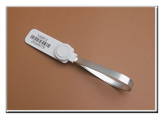 metal or plastic strap secured in a loop by inserting one end into or through a protected (covered) locking mechanism on the other end